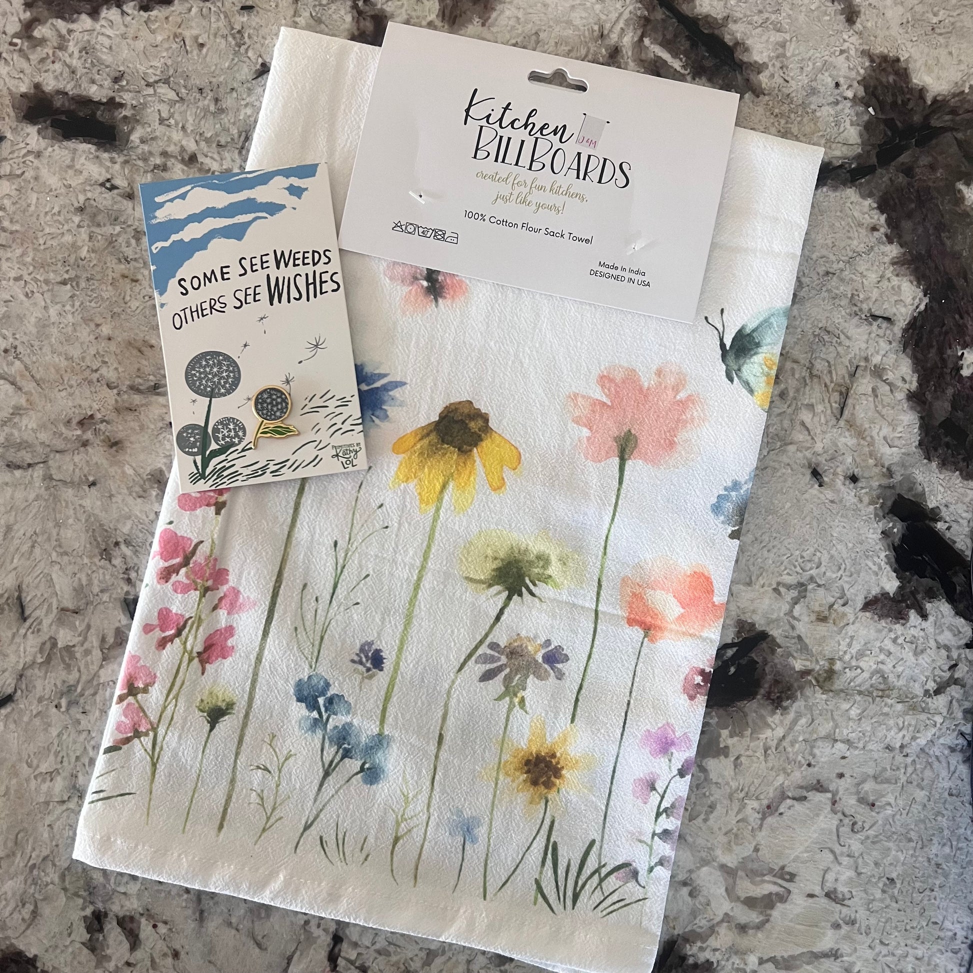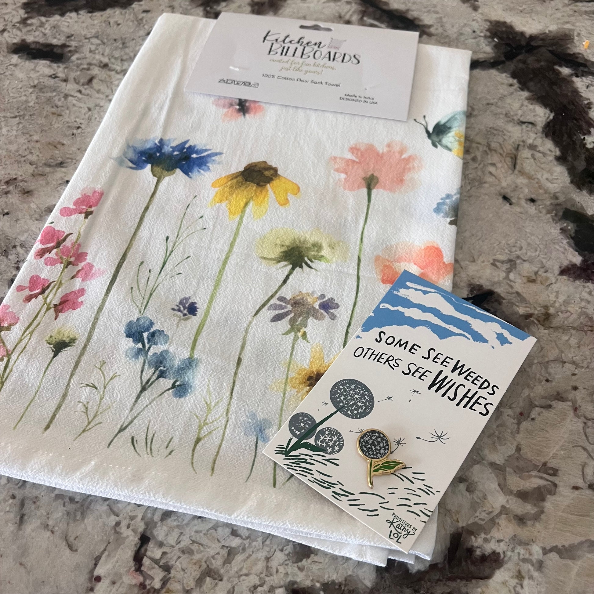 The “Some See Weeds, Others See Wishes” enamel apron pin — a sweet reminder to see the magic in the everyday.